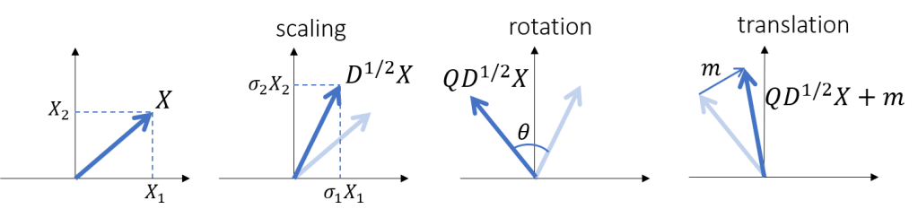 , we want to retrieve (if any!) the basic operations (scaling, rotation and translation) that led from independent normal variables
