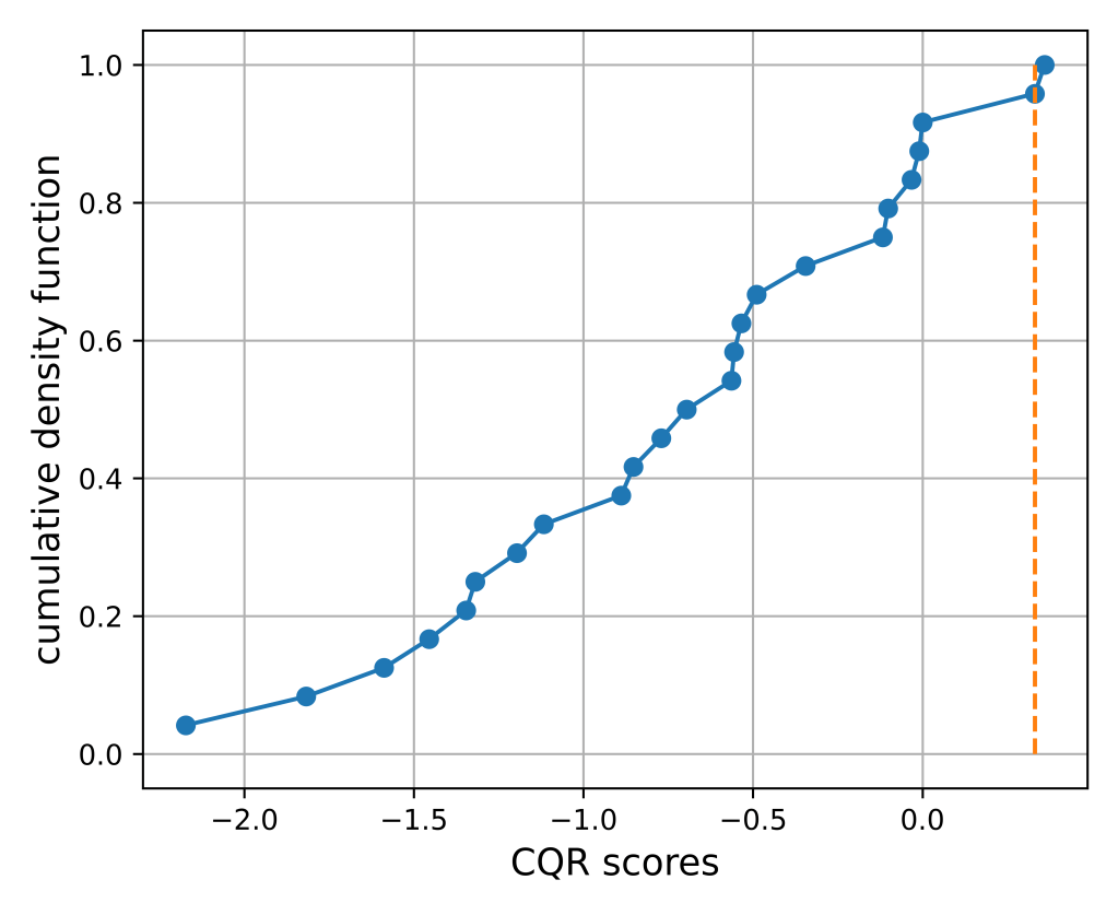 In this post we show how to achieve goals #1 and #2 via conformal quantile regression (CQR), first proposed by Y. Romano, E. Patterson and E. Candes in [1], which applies conformal prediction (CP) to quantile regression (QR) via a powerful and surprisingly simple-to-implement procedure.